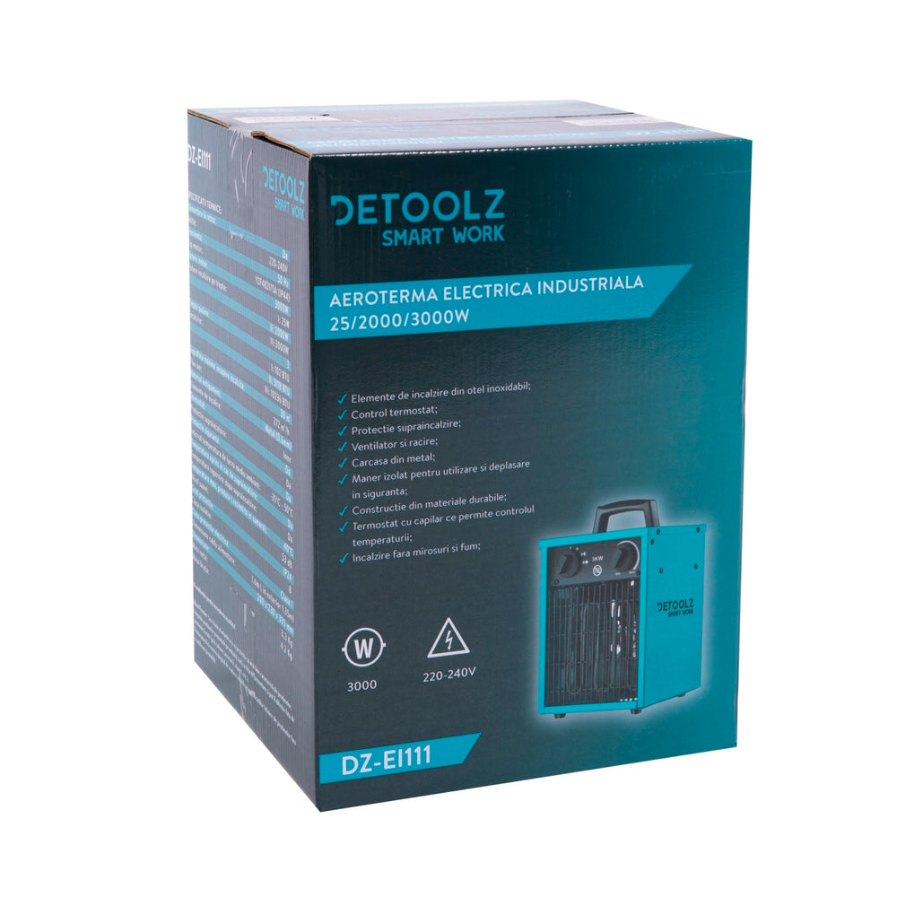 Aeroterma electrica industriala Detoolz DZ-EI111, cu puteri reglabile de 25 / 2000 / 3000 W, este solutia eficienta pentru încalzirea rapida a birourilor, atelierelor, spatiilor de depozitare sau serelor, în special în zilele reci de iarna.