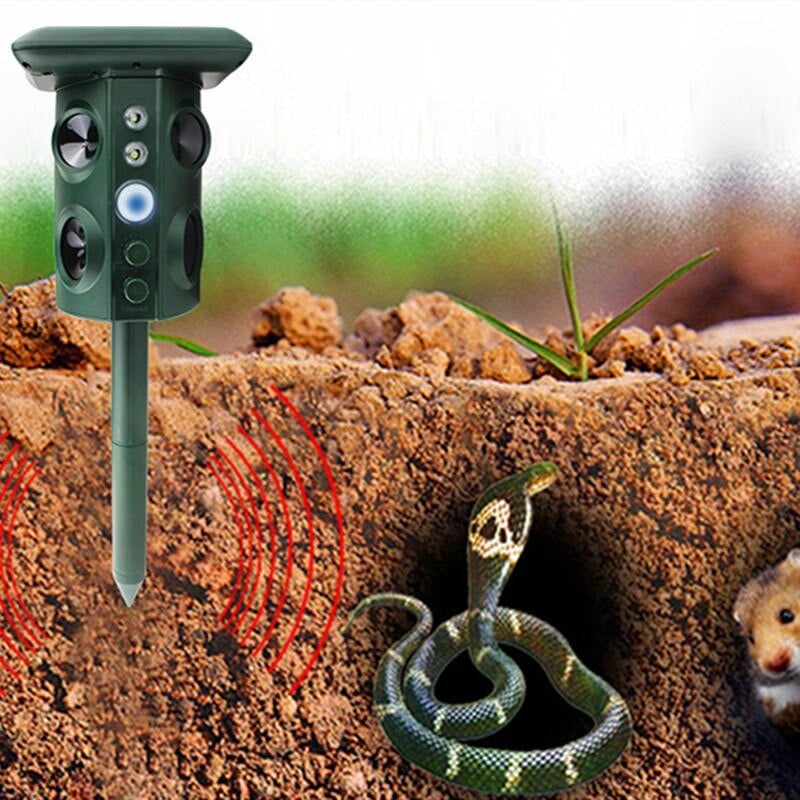 Repelent cu ultrasunete și vibrații: Dispozitivul emite ultrasunete și vibrații la frecvențe variabile (13.5 KHz - 45.5 KHz) pentru a respinge animale precum șerpi, câini, pisici, vulpi, mistreți, lilieci și rozătoare. Aceste frecvențe sunt intolerabile pentru animale, dar sigure pentru oameni și mediu.