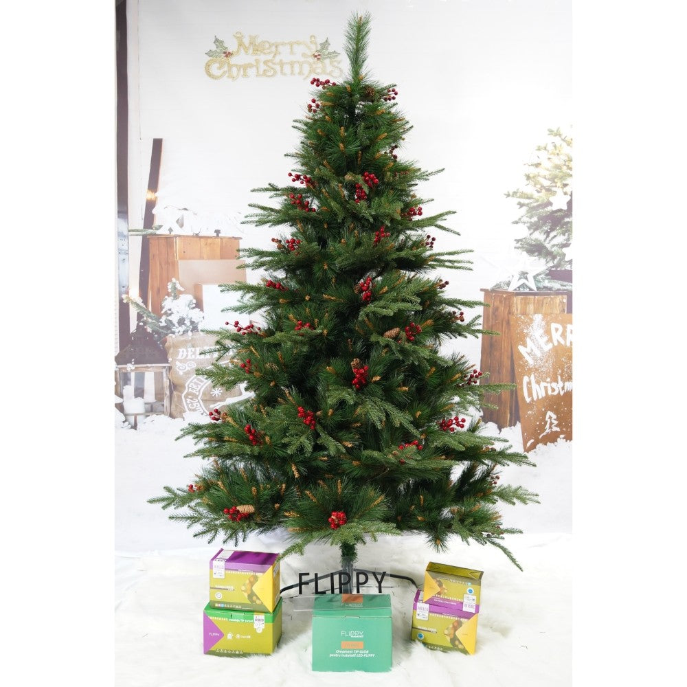 Brad artificial de Craciun, decorat cu conuri pin rosii, pentru interior/exterior, inaltime 210 cm, diametru 142 cm, 767 ramuri, Kadeny, verde, suport metalic inclus