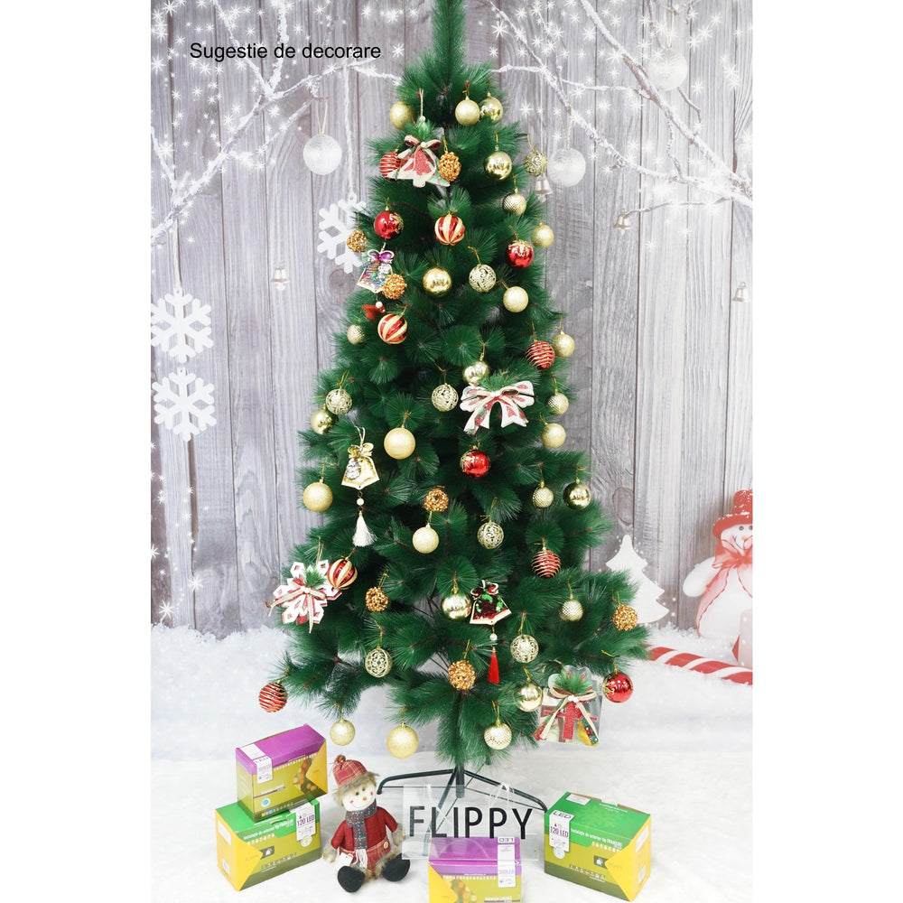 Brad artificial de Craciun tip pin, inaltime 210 cm, diametru 115 cm, 350 ramuri cu ace 3D 12 cm, Kadeny, verde, suport metalic inclus