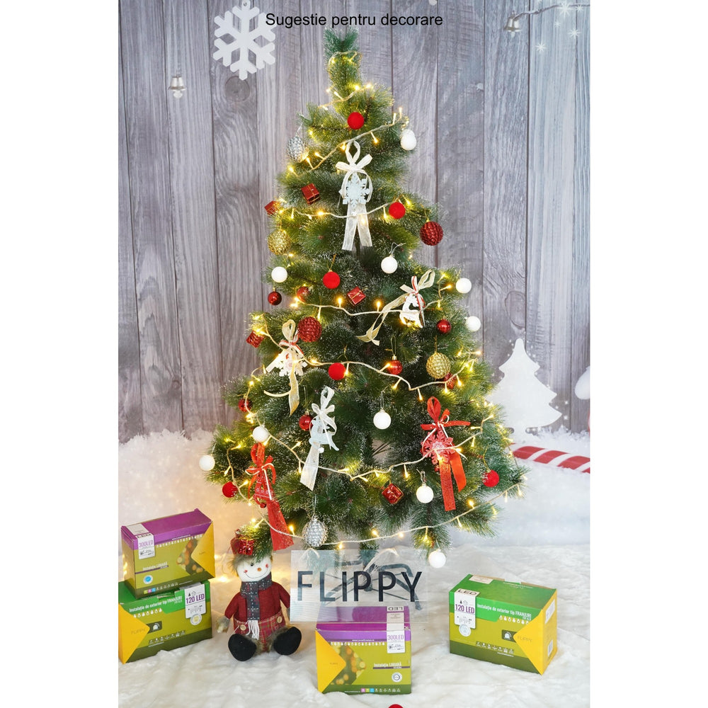 Brad artificial de Craciun tip pin inzapezit, inaltime 150 cm, diametru 85 cm, 160 ramuri cu ace 3D 12 cm, Kadeny, verde cu varfuri ninse, suport metalic inclus