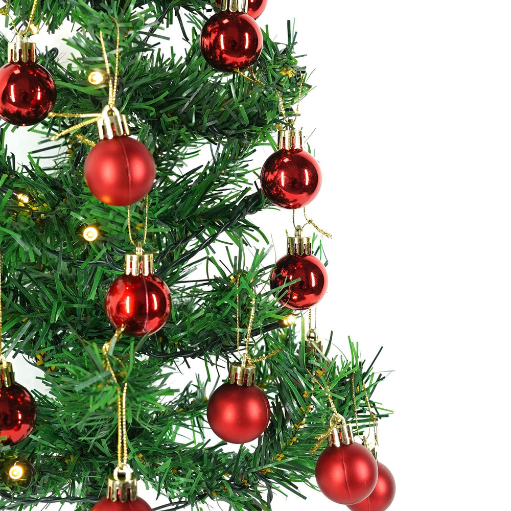 Bradul necesita asamblare.Pachetul contine o instalatie de 20 LED-uri pe baterii si 20 de globuri rosii si suportul din plastic.