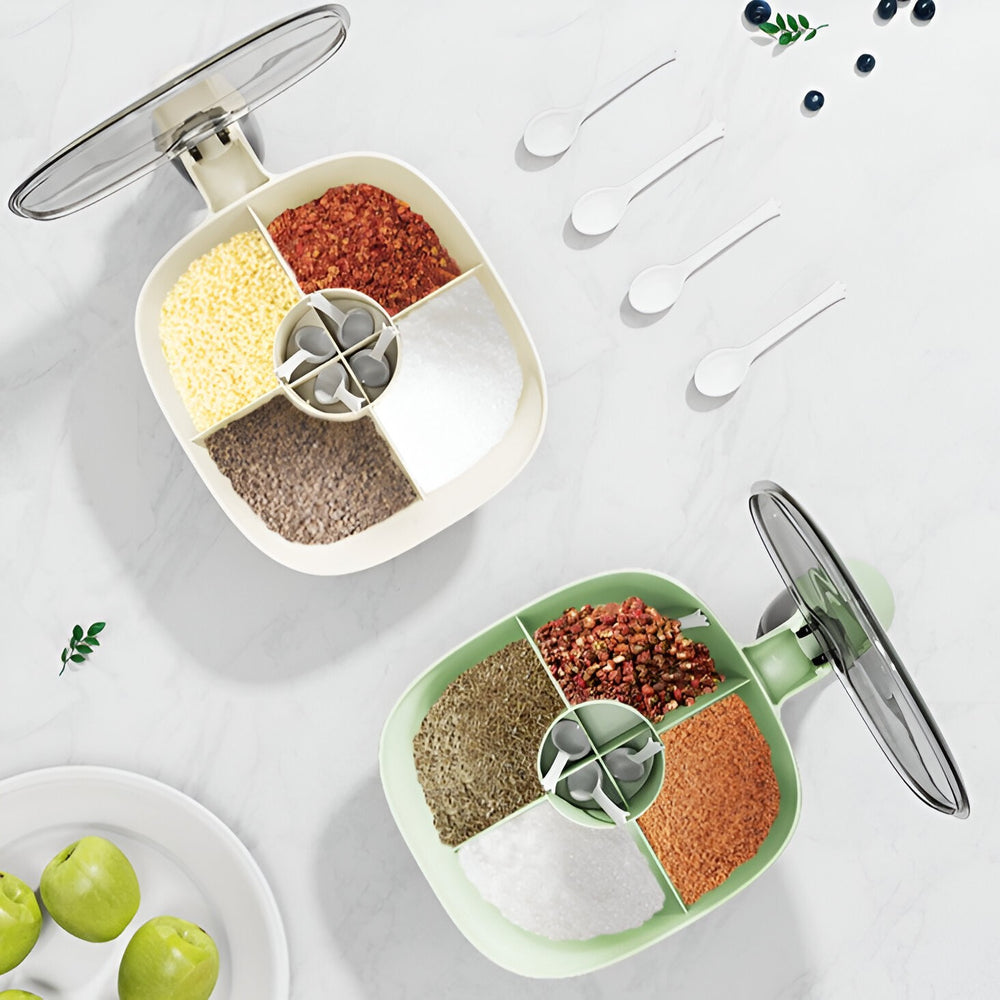 Poate stoca diverse tipuri de condimente. Când trebuie să utilizați un anumit tip de condimente, trebuie doar să ridicați capacul. Este practic și păstrează aromele condimentelor.