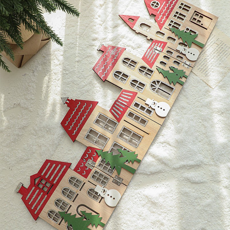 Designul sau pliabil il face usor de montat si depozitat, fiind ideal atat pentru bradul din living, cat si pentru cel de la birou sau vitrinele festive. Detaliile precum ferestrele decupate, brazii si oamenii de zapada adauga un aer autentic si cald, perfect pentru atmosfera de Craciun.