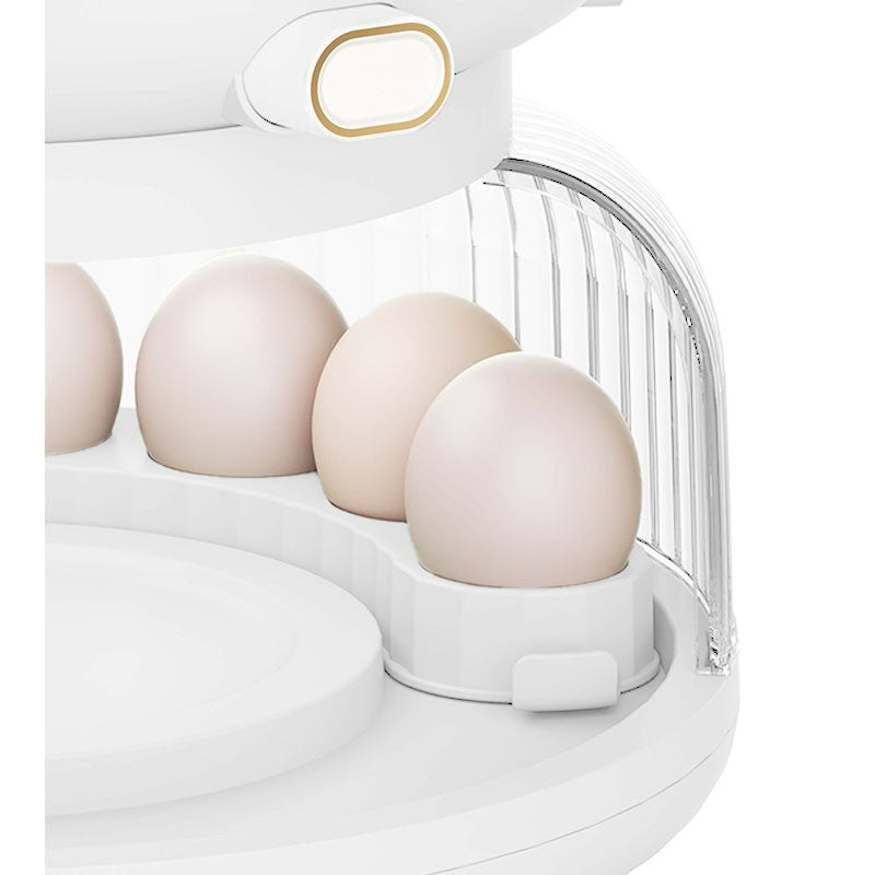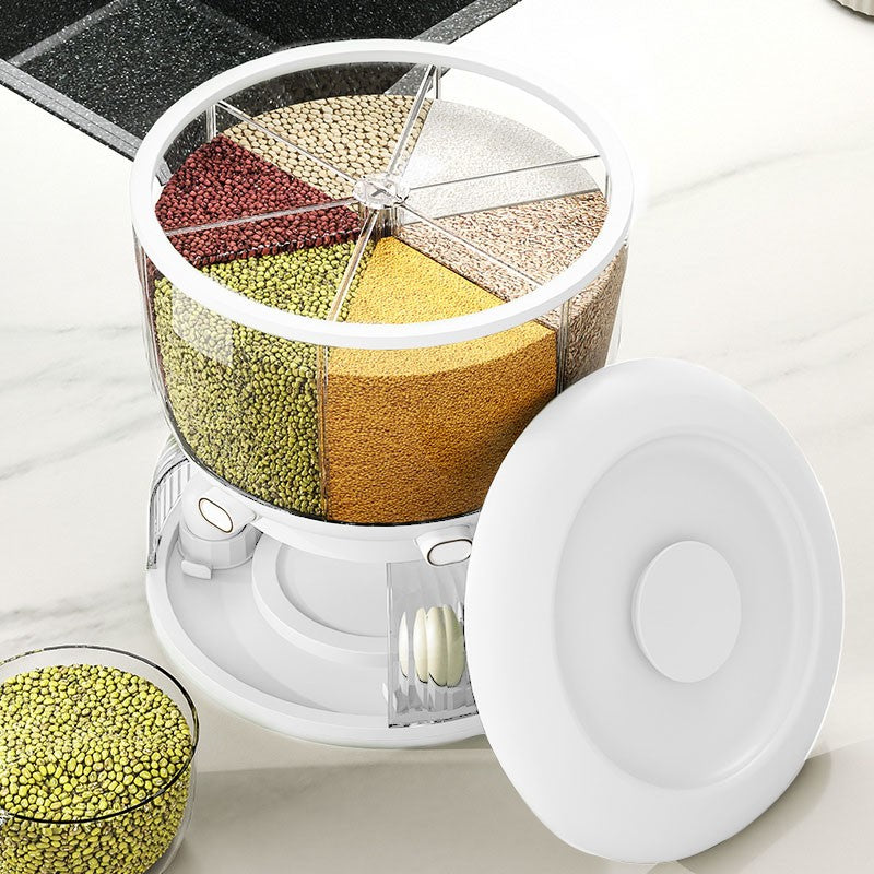 Dozator etajat de cereale Flippy, rotativ 360, 6 compartimente, capacitate 10L, cofrag special pentru oua, vas pentru scurgerea cerealelor, 35x27.5 cm, alb