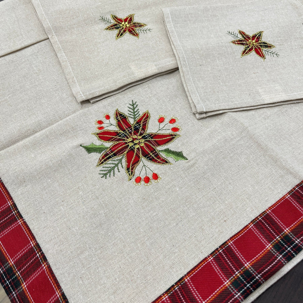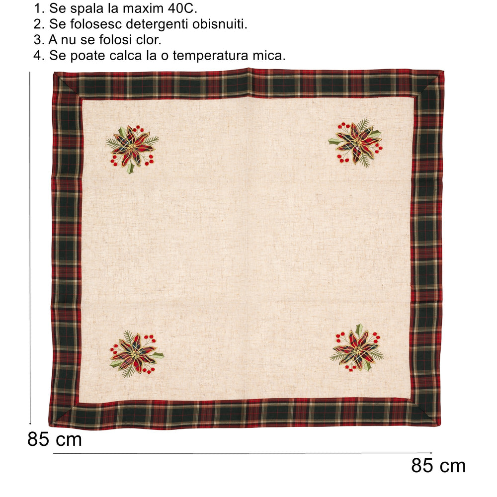 Fața de masă Flippy cu motive florale de Crăciun adaugă o notă de eleganță și frumusețe la orice masă festivă. Realizată din material brodat, această față de masă de 85x85 cm îmbină tradiția Crăciunului cu un design floral subtil, oferind un cadru perfect pentru momentele speciale.