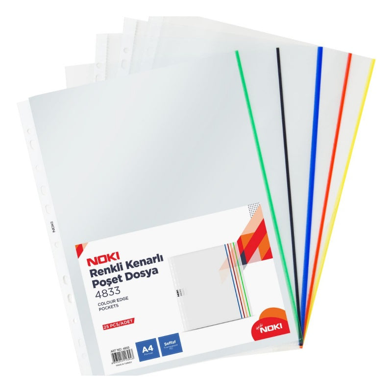 Folie de protectie Noki 4833, A4, portret, 70 microni, plastic, transparent, cu perforatii, margini colorate, set 25 buc