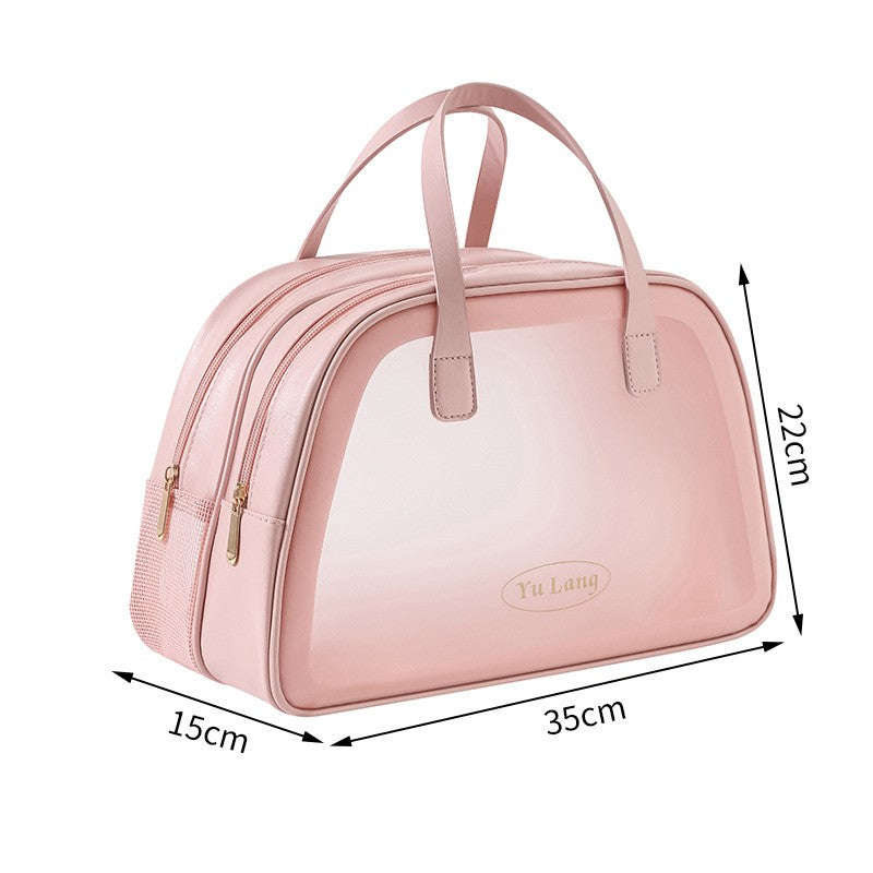 Maner și Portabilitate: Cu o curea de mână rezistentă, geanta poate fi ușor transportată în mână sau agățată pe diferite suporturi, cum ar fi tija de duș sau suportul pentru prosoape. Dimensiunile compacte fac geanta potrivită pentru utilizarea zilnică sau pentru călătorii.
