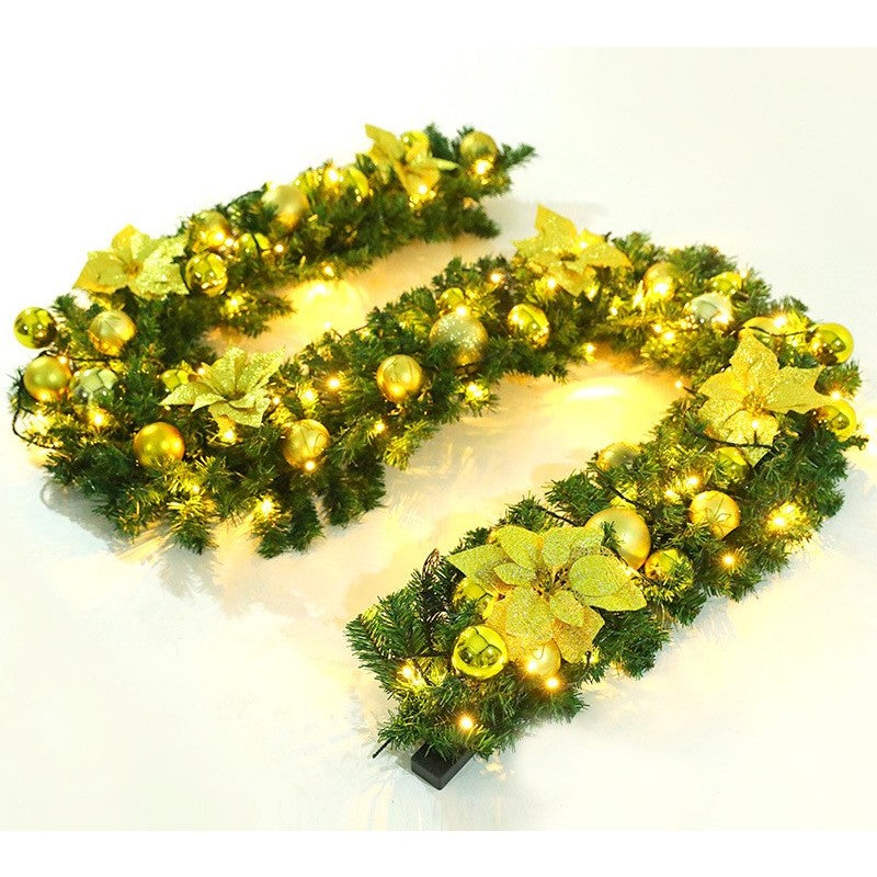 Ghirlanda este realizata din PVC si are lungimea de 270 centimetri. Ghirlanda confectionata din frunze verzi este impodobita cu fundite aurii si globuri de Craciun aurii. Aceasta are adaptata in jurul ei si o instalatie cu lumina calda.