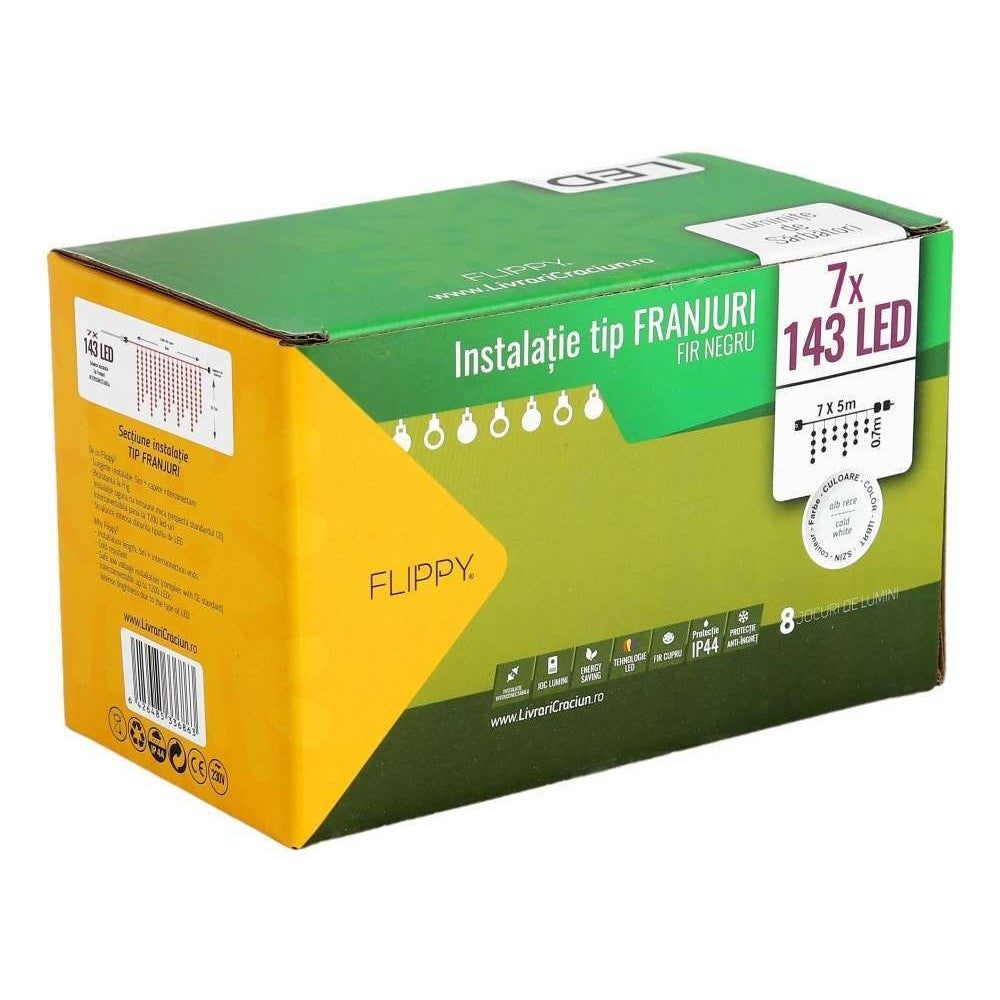Instalatia de Craciun Flippy de tip Franjuri are 8 jocuri de lumini si se poate folosi pentru decoratiuni interioare si exterioare, fiind prevazuta cu protectie IP44( material rezistent la umezeala/ inghet si protejeaza impotriva patrunderii corpurilor straine solide cu diametru 1 mm si mai mari).
