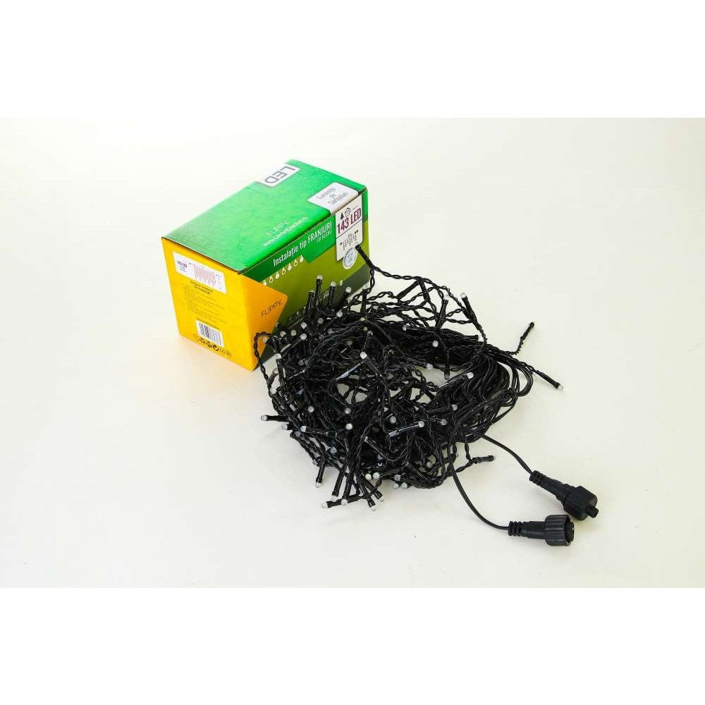 Instalatia luminoasa este de tip franjuri si are 143 LED-uri de culoare alb rece, avand o lungime de 5m, cu fir negru realizat dintr-un plastic anti-inghet, iar firele electrice sunt fabricate din cupru. Lungimea cablului de alimentare este de 3 metri. Ofera posibilitatea de a suspenda ghirlanda astfel incat sa poata fi ascuns cablul de alimentare atunci cand este conectat la priza.