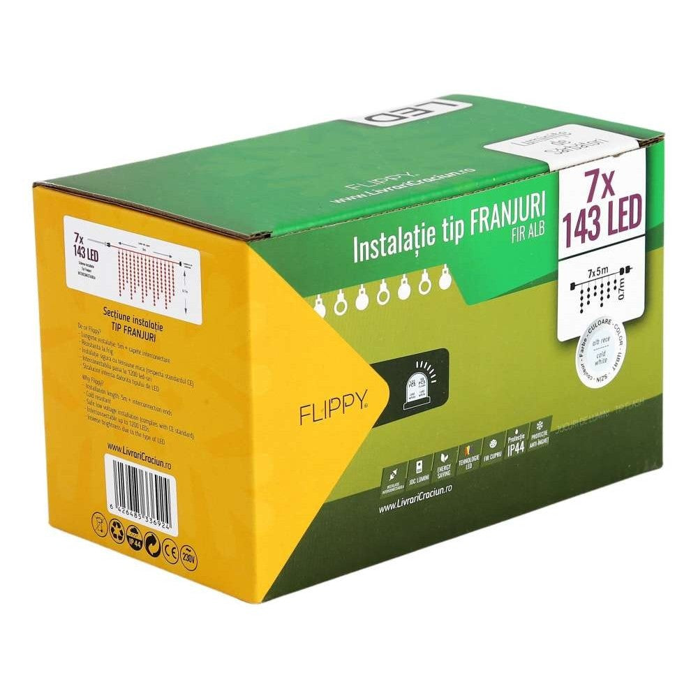 Instalatia de Craciun Flippy iti aduce lumina Craciunului prin cele 1001 de LED-uri de culoare alb rece, dispuse sub forma de franjuri. Tehnologia LED si functia Flash asigura ca locul in care este dispusa ghirlanda va avea un cadru festiv. Culoarea alba a firului contribuie la mentinerea magiei, fara a intrerupe vizual efectul luminitelor. Ghirlanda ofera o suprafata luminoasa de 35m. Lungimea cablului de alimentare de 3 metri ofera posibilitatea de a nu fi vizibil atunci cand se doreste suspendarea ghirlandei. Materialul cablului este din plastic, cu grad de protectie IP44 ce garanteaza rezistenta la umiditate, inghet si patrundurea corpurilor straine solide egale sau mai mari cu 1mm. Cablul contine fire de cupru.