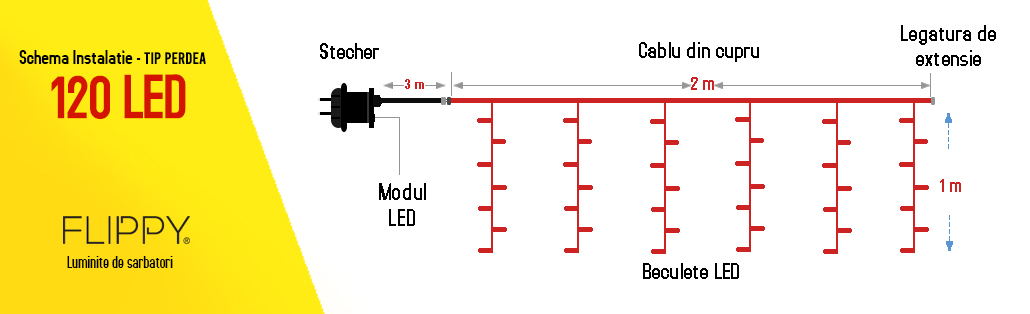 Bucura-te de atmosfera sarbatorilor in stil magic. Instalatia de Craciun Flippy iti aduce lumina Craciunului la tine acasa sau la birou prin cele 120 de LED-uri de culoare alb rece, dispuse sub forma de perdea. Aceasta ofera o atmosfera magica locului in care este amplasata. Tehnologia LED si functia Flash asigura amenajarea unui cadru festiv oriunde va fi expusa ghirlanda. 10 de LED-uri dintre cele 120 dispun de functia Flash. Transparenta firului mentine magia si nu intrerupe vizual aspectul luminitelor. Aceasta instalatie pune la dispozitia dumneavoastra o suprafata luminoasa de 2 x 1m pentru un decor asa cum va doriti.