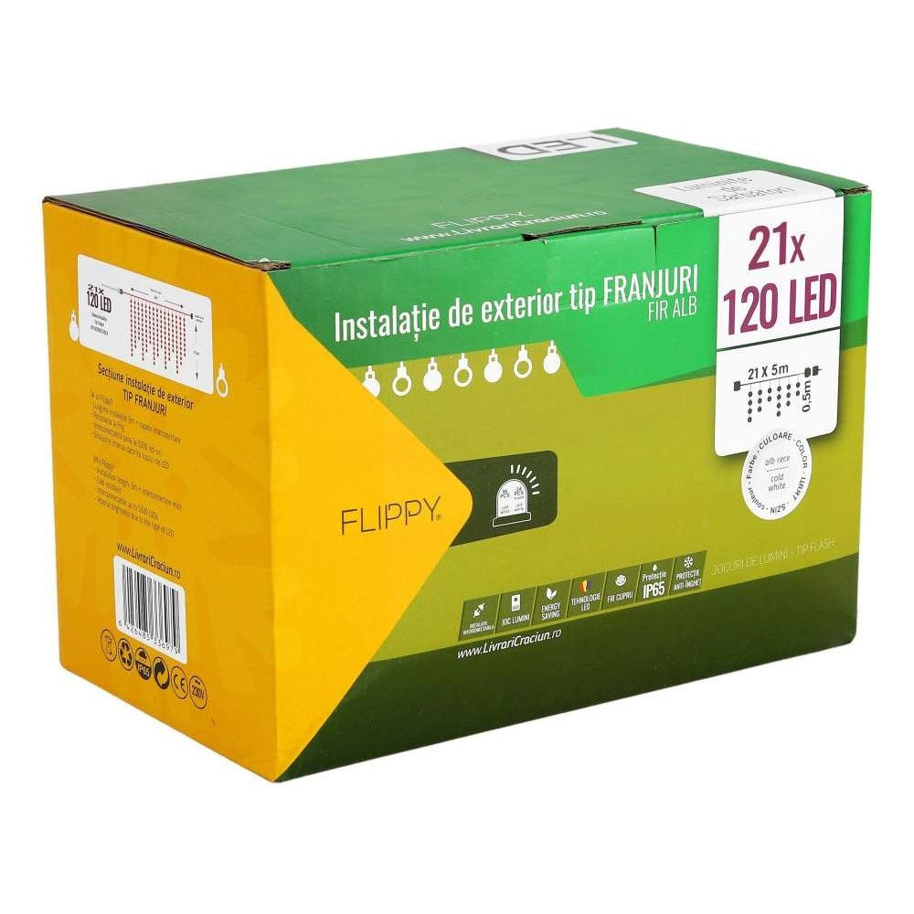 Produsul este format dintr-o instalatie de Craciun Flippy Premium de tip franjuri cu functie Flash de 105m (compusa din 21 sectiuni a cate 5m) si un cablu de alimentare IP65 de 1.5m.