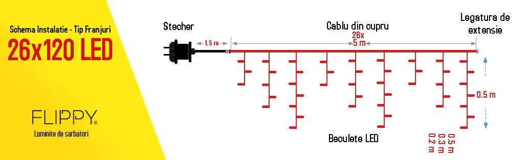 Produsul este format dintr-o instalatie de Craciun Flippy Premium de tip franjuri cu functie Flash de 130m (compusa din 26 sectiuni a cate 5m) si un cablu de alimentare IP65 de 1.5m.