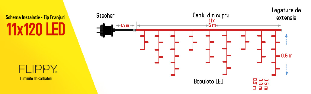 Produsul este format dintr-o instalatie de Craciun Flippy Premium de tip franjuri cu functie Flash de 55m (compusa din 11 sectiuni a cate 5m) si un cablu de alimentare IP65 de 1.5m.
