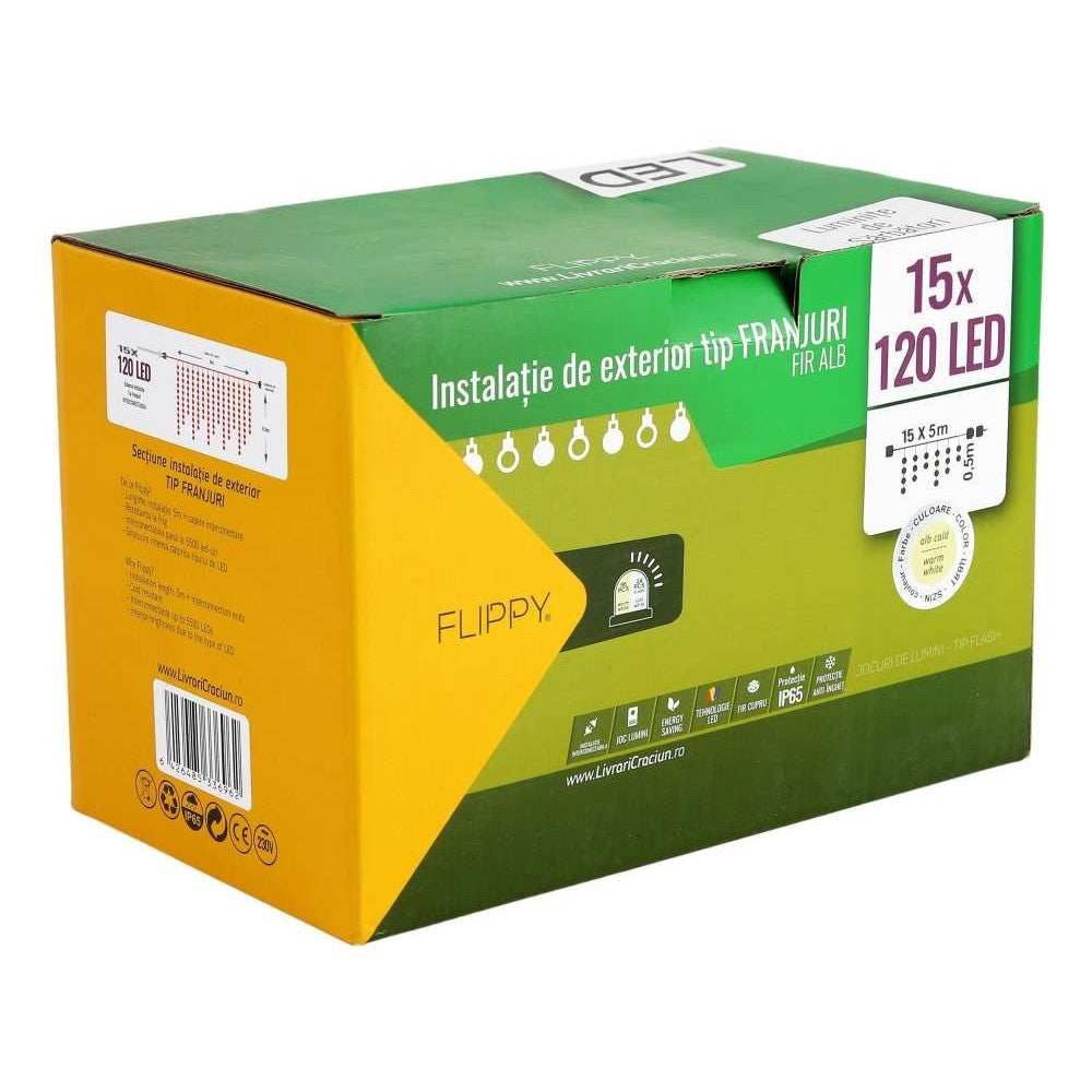 Produsul este format dintr-o instalatie de Craciun Flippy Premium de tip franjuri cu functie Flash de 75m (compusa din 15 sectiuni a cate 5m) si un cablu de alimentare IP65 de 1.5m.