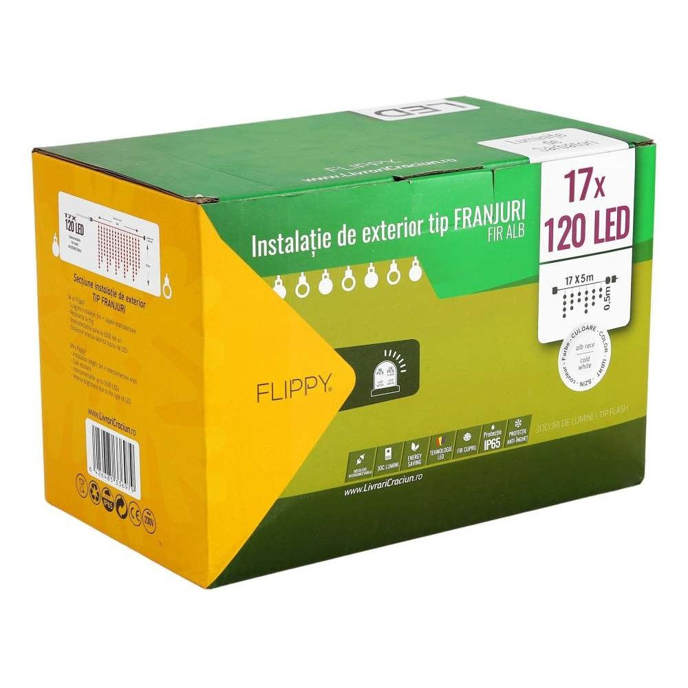 Produsul este format dintr-o instalatie de Craciun Flippy Premium de tip franjuri cu functie Flash de 85m (compusa din 17 sectiuni a cate 5m) si un cablu de alimentare IP65 de 1.5m.