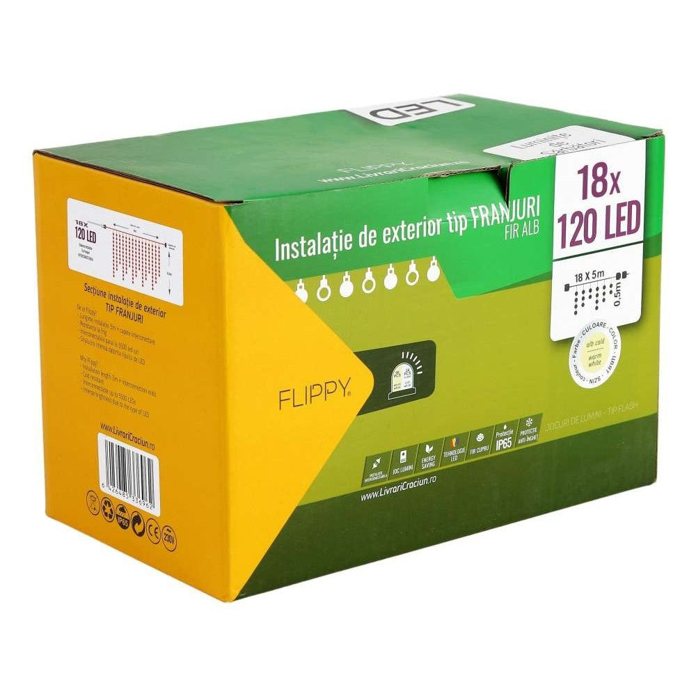 Instalatia de Craciun Flippy Premium iti aduce lumina Craciunului prin cele 2160 de LED-uri de culoare alb cald, dispuse sub forma de franjuri. Tehnologia LED si functia Flash asigura ca locul in care este dispusa ghirlanda va avea un cadru festiv. Culoarea alba a firului contribuie la mentinerea magiei, fara a intrerupe vizual efectul luminitelor. Formata din 18 portiuni a cate 120 de LED-uri cu o lungime de 5m, ghirlanda ofera o suprafata luminoasa de 90m. Lungimea cablului de alimentare de 1.5 metri ofera posibilitatea de a nu fi vizibil atunci cand se doreste suspendarea ghirlandei. Materialul cablului este din cauciuc, cu grad de protectie IP65 ce garanteaza rezistenta la umiditate, inclusiv jeturi de apa de presiune redusa, inghet si patrundurea corpurilor straine solide. Este o instalatie de Craciun tip franjuri ideala pentru exterior. Cablul contine fire de cupru.