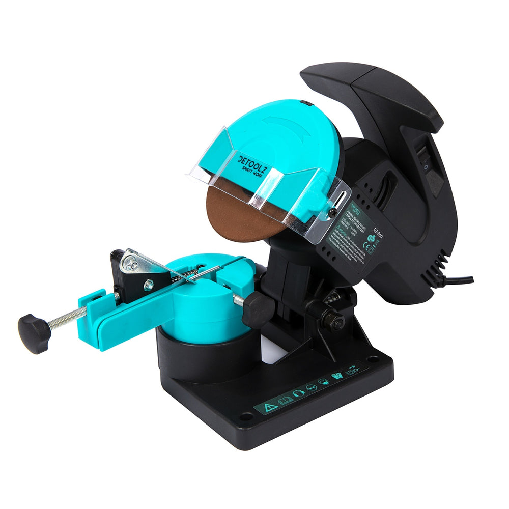 Masina pentru ascutit lantul de drujba 220W, Detoolz DZ-D111 este un model compact, usor, destinat ascutirii lanturilor de drujba in gospodarie sau in unitatiile de exploatare mici. La baza acesteia este atasata o placa turnata care este instalata la unghiul dorit, in functie de parametrii dintilor de drujba. Lantul prelucrat este fixat ferm in canelura de ghidare, apoi discul este coborat, ceea ce duce la o ascutire ideala.