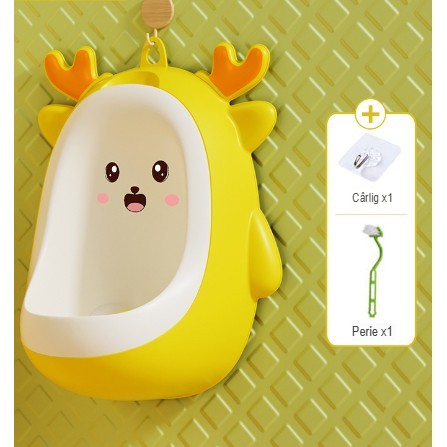 Pisoar pentru Baieti, Kadeny, 0-8 Ani, in Forma de Cerb, Perie Inclusa, Montare pe Perete, Carlig Autoadeziv Inclus, 29.8 x 23.8 cm, Galben