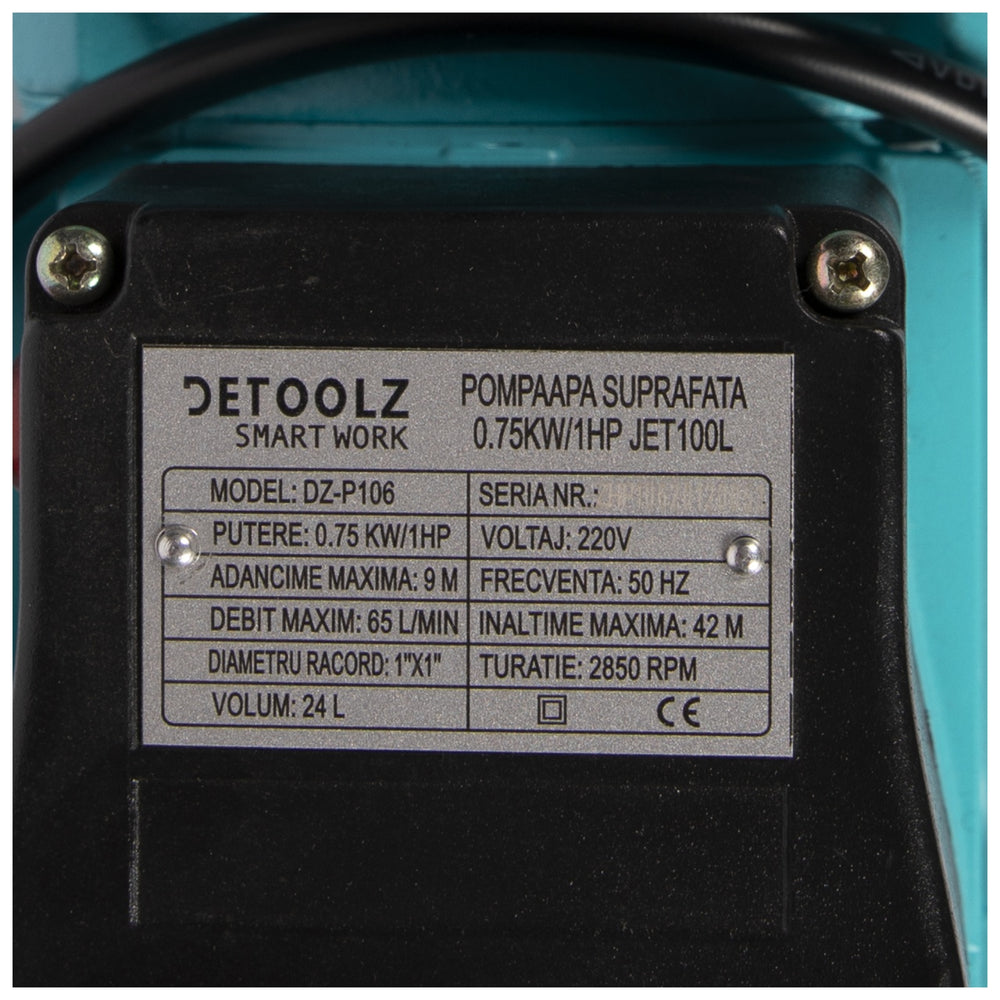 Pompa apa de suprafata, 0,75kW/1HP JET 100 L, Detoolz DZ-P106 este proiectata pentru pomparea apei curate si lichide non-corozive. Avantajele majore ale acestei pompe sunt fiabilitate, capul de descarcare mare, cap aspirare mare si timpul de auto-amorsare destul de scurt. Prin urmare, este utilizata pe scara larga pentru irigatii gradina, terenuri agricole, alimentare cu apa la cladiri inalte, pepiniere de flori, nave etc. Pompa apa de suprafata centrifugala autoamorsanta are o putere 0.75 kw. Turbina este din bronz rezistent la coroziune. Axul si corpul pompei sunt din inox.