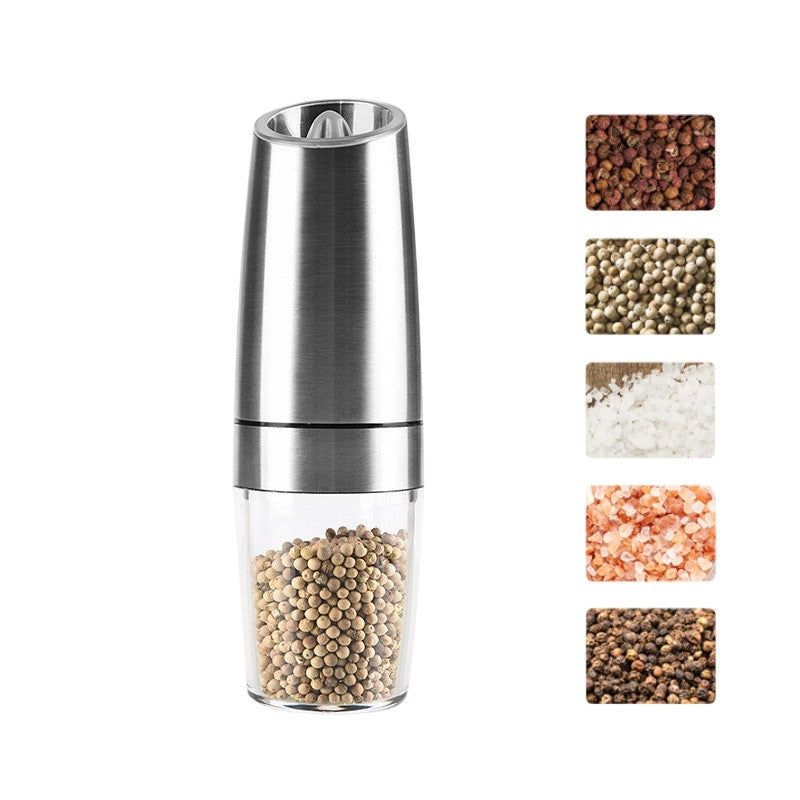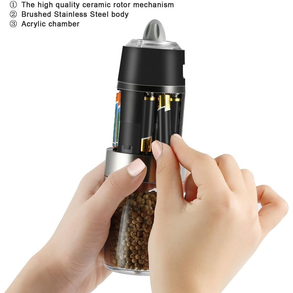 Rasnita Electrica Sare si Piper, Kadeny, cu Camera Depozitare Transparenta, Macinare, Functionare pe Baterii, cu Lumina, ABS, 20x6.5 cm, Argintiu/Transparent