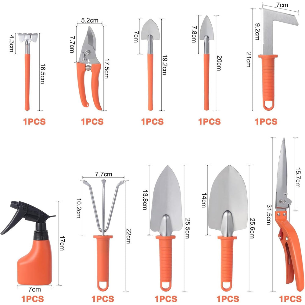 Set 10 Unelte de Gradina, Kadeny, pentru Plantare Prelucrare Sol si Ingrijire Plante, Manere Portocalii, Material PVC si Otel Inoxidabil, Cutie Inclusa, 37x28x7 cm, Negru