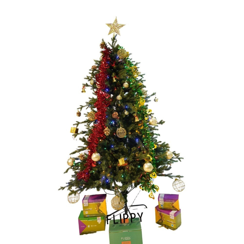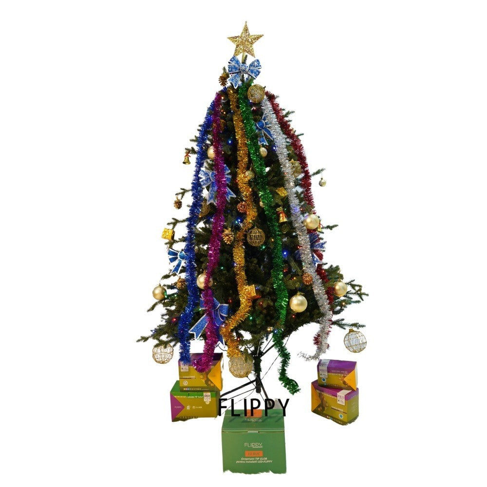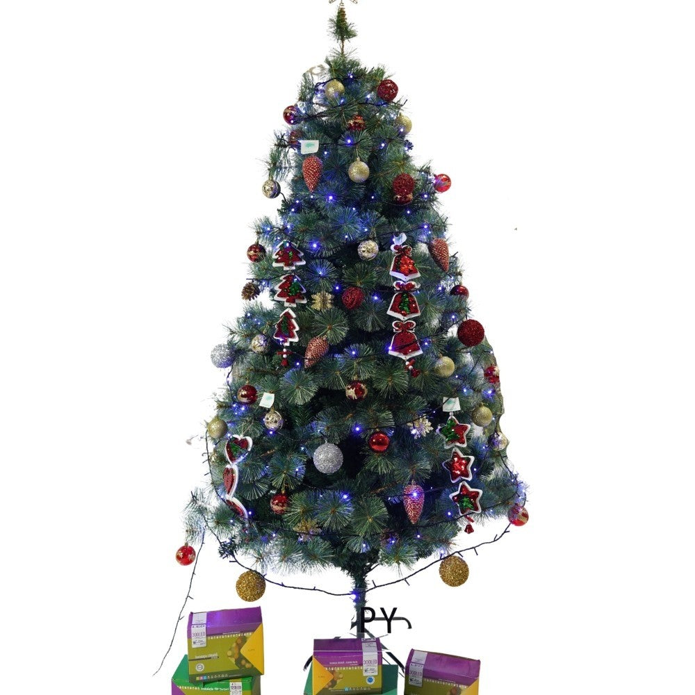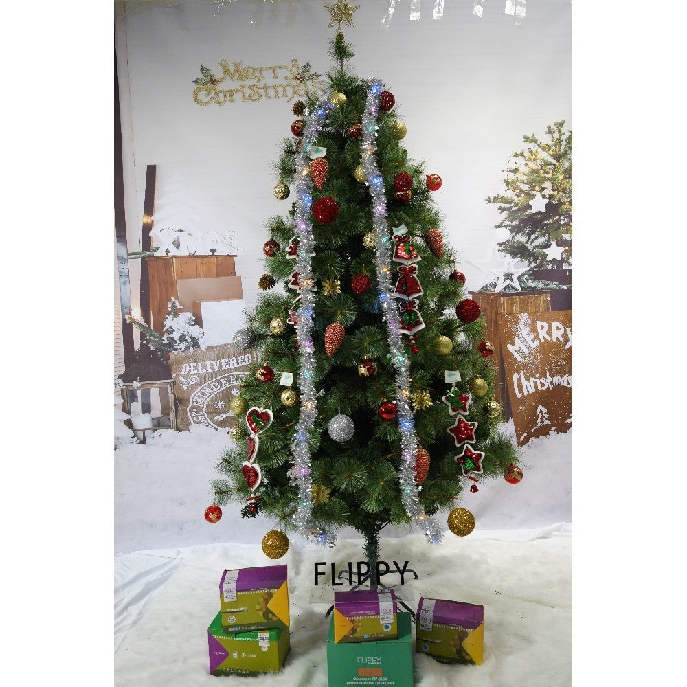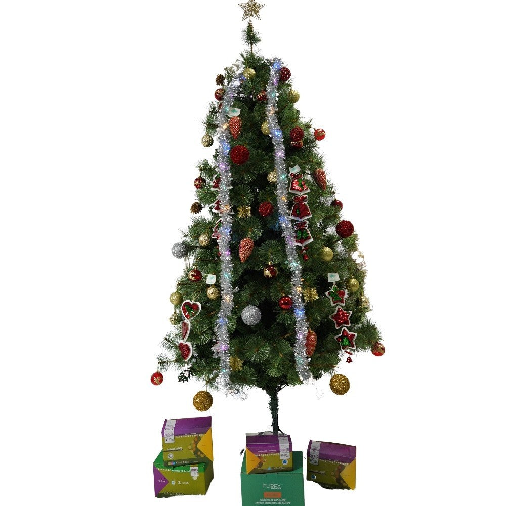 Set brad artificial de Craciun si elemente decorative, Becuri led incluse in ramuri, pentru interior/exterior, inaltime 180 cm, diametru 128 cm, 1246 ramuri, Kadeny, verde, suport metalic inclus