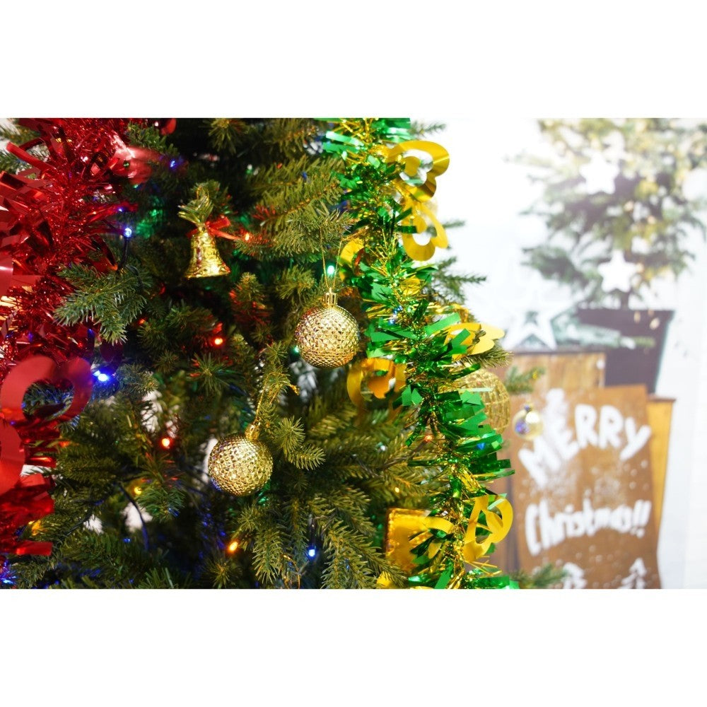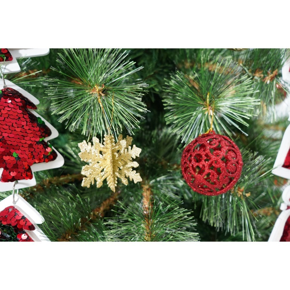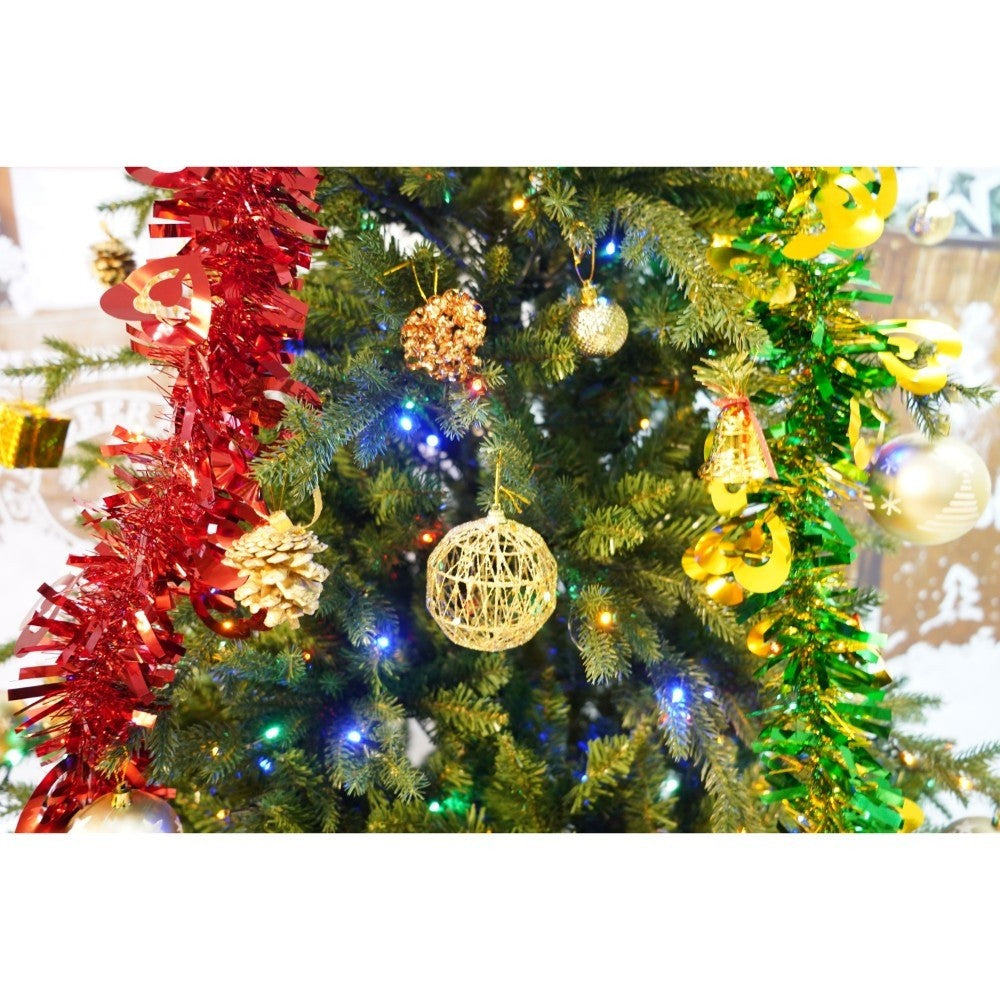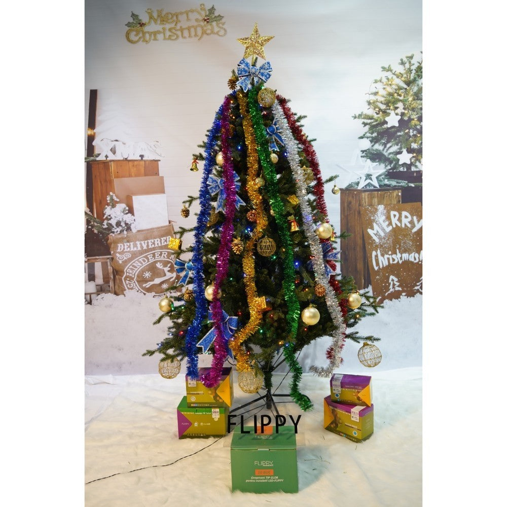 Set brad artificial de Craciun si elemente decorative, Becuri led incluse in ramuri, pentru interior/exterior, inaltime 180 cm, diametru 128 cm, 1246 ramuri, Kadeny, verde, suport metalic inclus
