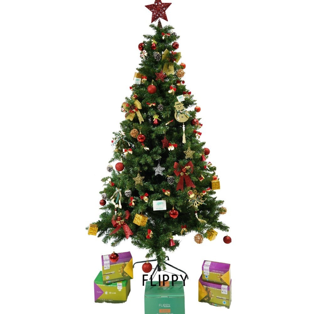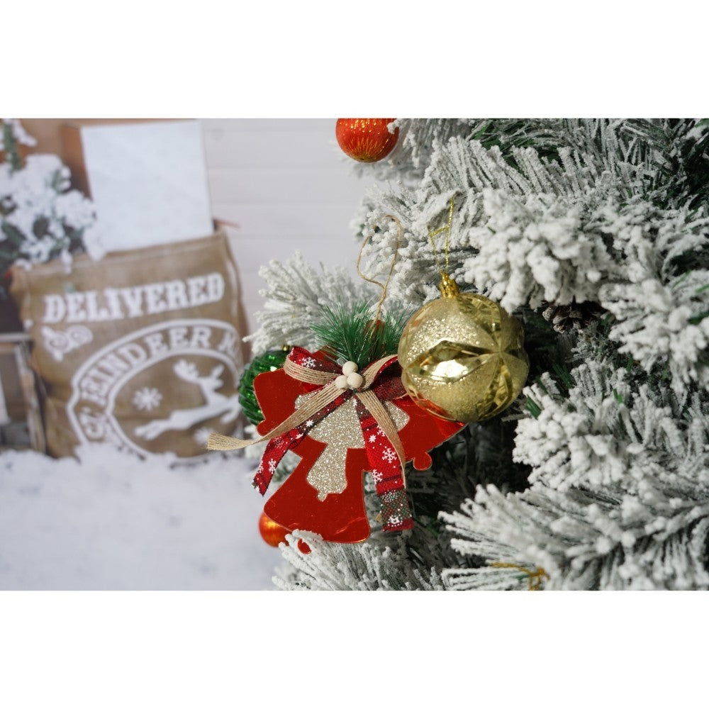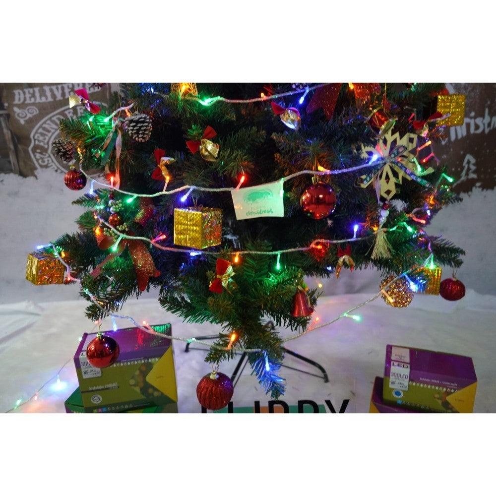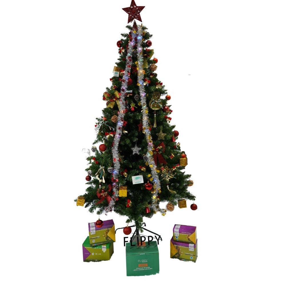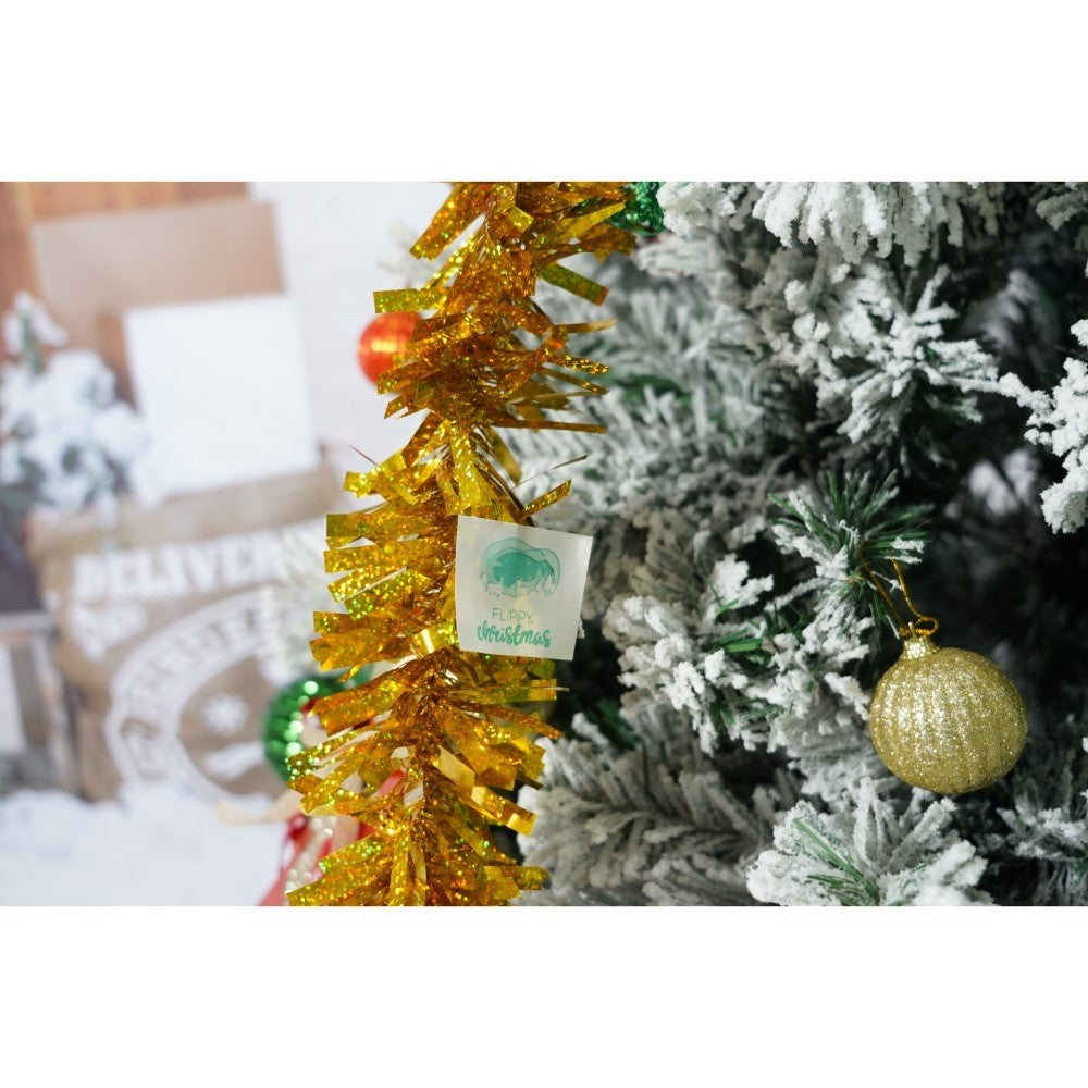 Set brad artificial de Craciun si elemente decorative, nins, decorat cu conuri pin, pentru interior/exterior, inaltime 210 cm, diametru 131 cm, 630 ramuri, Kadeny, alb/verde, suport metalic inclus