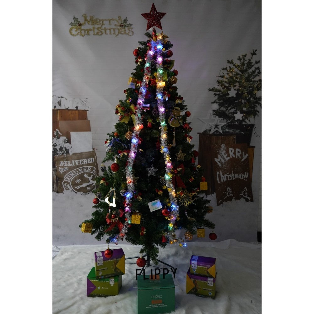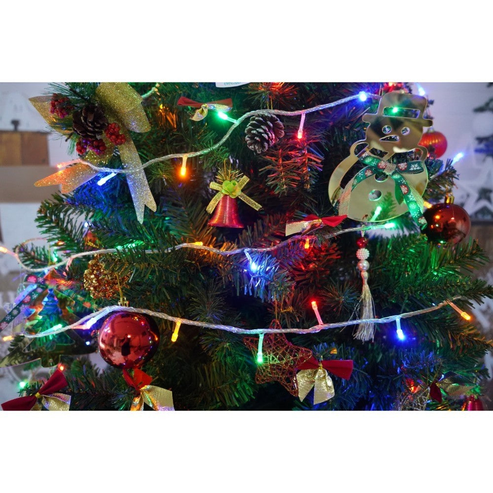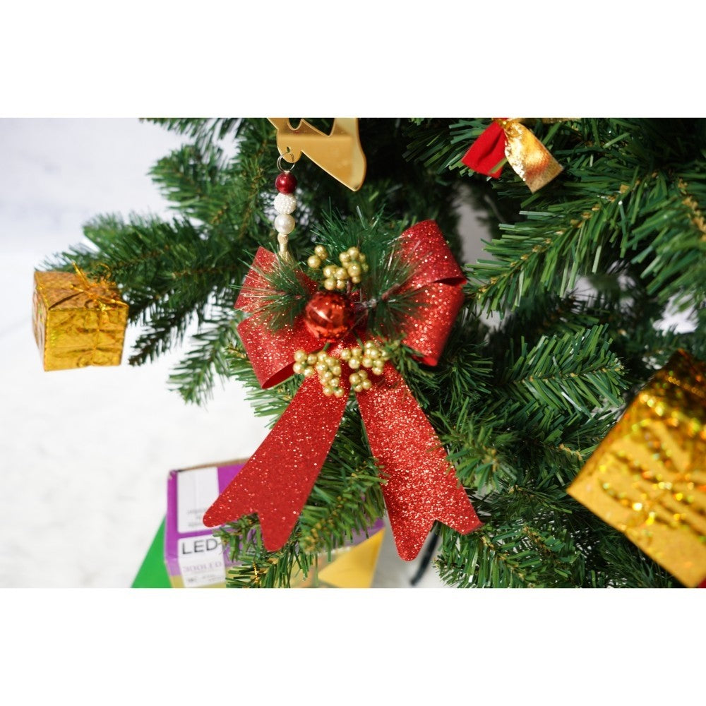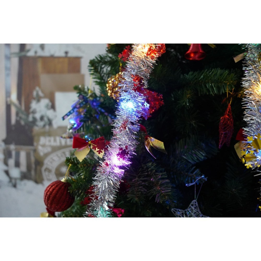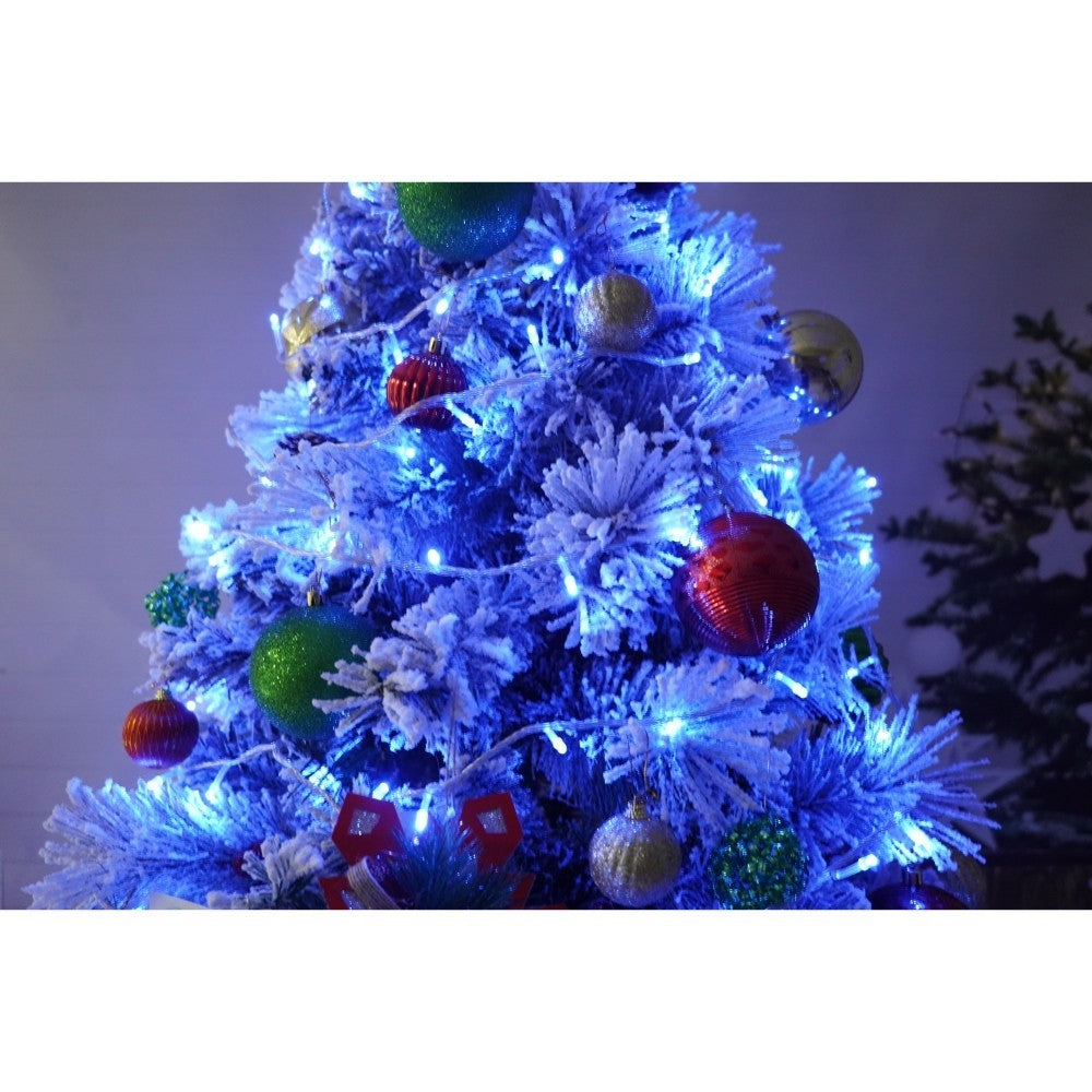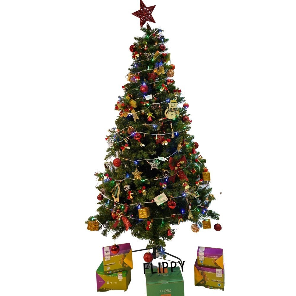 Set brad artificial de Craciun si elemente decorative, nins, decorat cu conuri pin, pentru interior/exterior, inaltime 210 cm, diametru 131 cm, 630 ramuri, Kadeny, alb/verde, suport metalic inclus