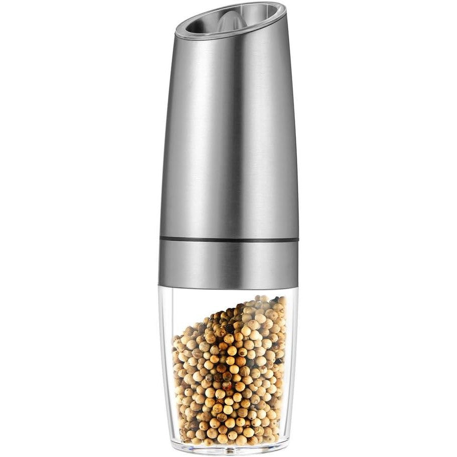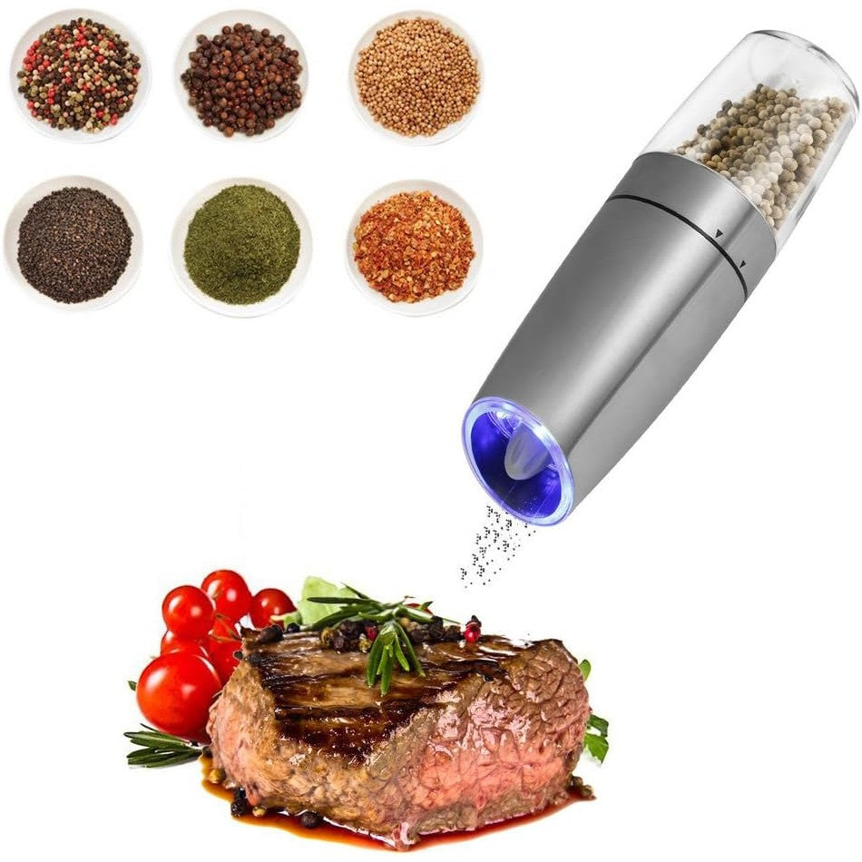 Set de 2 Rasnite electrice de Sare si Piper, Kadeny, cu Camere Depozitare Transparente, Macinare, Functionare pe Baterii, cu Lumina, ABS, 20x6.5 cm, Argintiu/Transparent